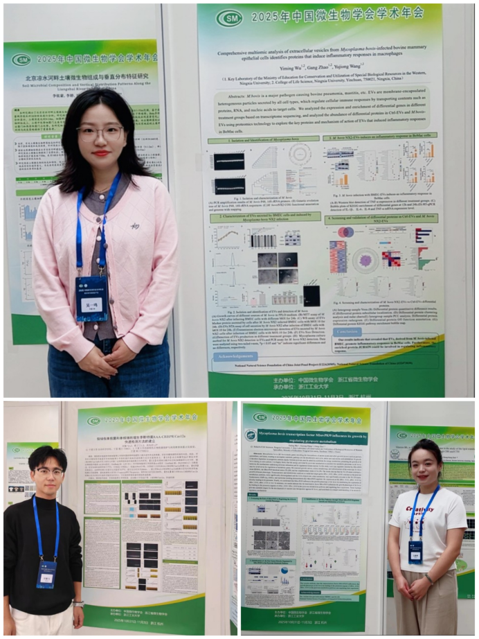 桂子月中落,天香云外飘,微生物学领域的年度盛会——2025年中国微生物学会学术年会,于2025年10月31日至11月3日在杭州举行。学术年会作为微生物学界一年一度的“华山论剑”,本次会议以“微生物与新质生产力”为主题,由中国微生物学会和浙江省微生物学会主办,吸引了来自全国各地微生物学领域380余个高校及科研院所等单位的1100余名专家学者。徐建国、郑裕国、周集中等多位院士以及众多顶级学者齐聚一堂,共商前沿发展。学院王玉炯教授、邓光存教授、李敏教授和吴晓玲教授带领博士生蔡卫卫、吴一鸣,硕士生田继飞、马嘉婷参加会议,并开展多层次的学术交流。