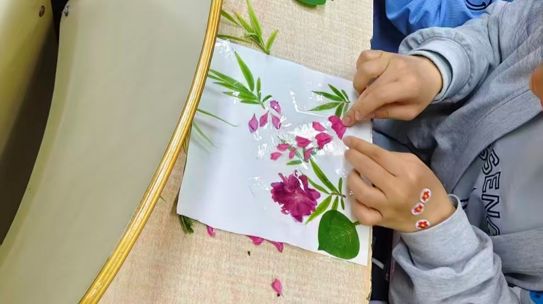 在DIY创作环节,同学们以方巾为画布、以草木为笔墨,亲手敲拓出一幅幅兼具自然之美与红色意蕴的专属作品。敲打声此起彼伏,创意在指尖流淌。在作品分享环节,大家踊跃展示自己的方巾,交流创作思路与红色感悟,现场气氛热烈而温馨。